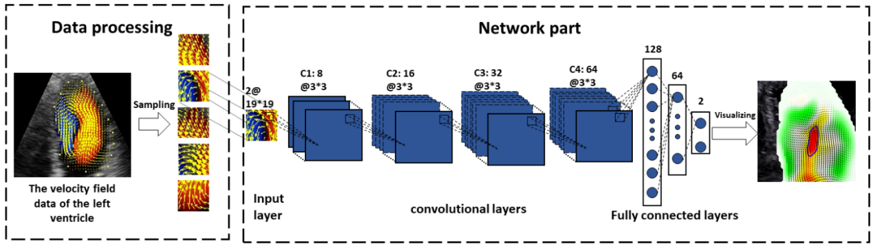 基于超声技术采集心腔内的血流速度,采用自动分割方法对左心房的漩涡进行识别。我们以CNN网络为基础,创新性设计了一种专门用于识别心腔内漩涡的IVD-CNN网络(如图7所示)。
