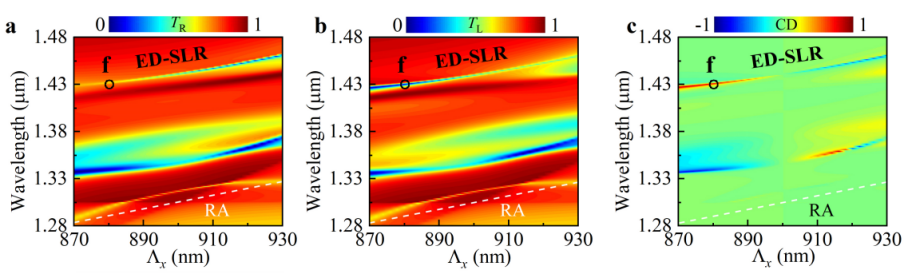研究人员进一步研究了等周期时该结构在斜入射下的外在手性,仿真与实验结果表明,当斜入射角度为0.5 时,波长为1.35微米附近的窄峰模式具有更强的手性,其圆二色值为0.7,同时Q值达到872,此时瑞利衍射波长,如图3(a)所示。