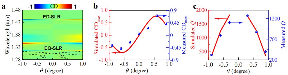 手性(Chirality)是自然物体的基本性质之一,当物体无法顺利获得旋转、平移等操作与其镜像体相重合时,该物体就具有手性。许多生理现象的产生都源于分子手性的精确识别与严格匹配,因此手性光谱检测在制药、食品监测、疾病检测等工业生产和生物医学方面有着重要的应用价值。天然材料通常由于其原子特征尺寸与光波长之间的巨大失配而表现出非常微弱的手性,极大地限制了其应用。在包括手性光生化传感、圆偏振光辐射等众多的手性光学应用中,高Q值的强手性响应对于其器件性能尤为重要。