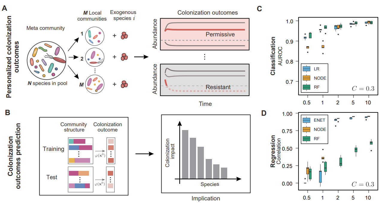 第一时间,研究团队顺利获得广义Lotka-Volterra模型的解析推导和计算模拟,证明了在训练数据量与微生物群落物种多样性相当的情况下,随机森林、神经常微分方程等机器学习模型可以基于肠道菌群的物种组成准确预测外源物种的定殖结果和稳态丰度(图1)。