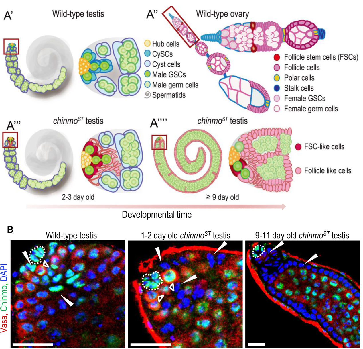 图2:野生型精巢、chinmoST突变型精巢和野生型卵巢示意图,以及野生型和chinmoST突变型精巢染色图