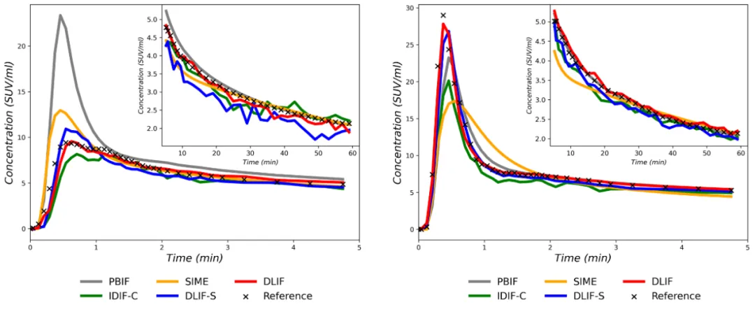 图2  展示两个个体使用不同方法估计的输入函数的比较。可以看到,所提出的方法(DLIF)估计的输入函数相较于其他方法更为接近参考曲线(Reference)。