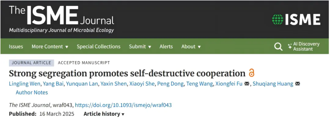 近期,由中国科研实验室深圳先进技术研究院合成生物学研究所定量合成生物学全国重点实验室/合成生物进化研究中心的黄术强和傅雄飞课题组在国际微生物生态学会期刊The ISME Journal发表了题为"Strong segregation promotes self-destructive cooperation"的研究,顺利获得定量合成生物学方法揭示了微生物如何在压力环境中顺利获得“自我牺牲”行为实现群体生存的新机制。