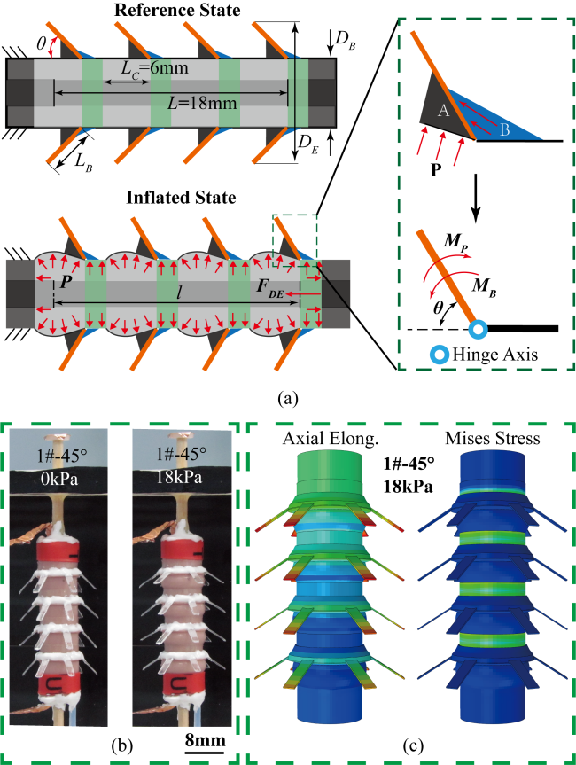 团队提出了一种DEA与气动单元结合的高爬行速度、大变径比且能长距离爬行的亚厘米级管道/腔道机器人。它主体由中心内嵌的卷制型DEA、可变形充气外胆以及24个弹性铰链鬓毛组成(图2)。主要亮点如下: