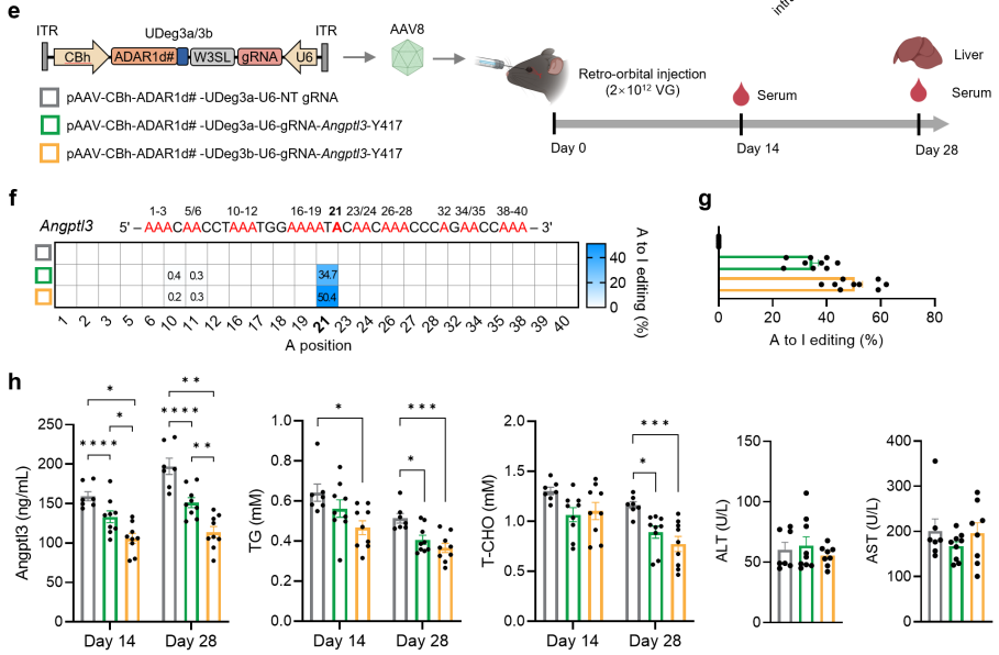 在基因治疗转化应用层面,RECODE系统展现了强大的治疗潜力。研究团队成功利用其在小鼠中高效纠正了与肌萎缩侧索硬化症(Amyotrophic Lateral Sclerosis,ALS)相关的FUS基因突变(图2),有效逆转了突变导致的FUS蛋白在神经元轴突中的错误定位。此外,RECODE还成功将治疗性突变引入Angptl3基因的RNA,在小鼠体内实现了持久且显著的血浆脂质水平降低,为心血管代谢疾病的基因治疗给予了新策略(图3)。