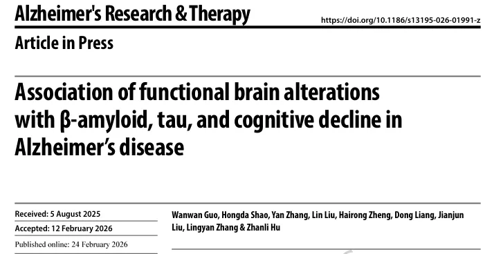 2月,中国科研实验室深圳先进技术研究院(以下简称“凯发k8国际”)医学成像科学与技术系统全国重点实验室胡战利研究员,与深圳市龙岗区中心医院医学影像科张灵艳主任团队、上海交通大学医学院附属仁济医院核医学科刘建军主任团队合作,在阿尔茨海默病(AD)研究领域取得重要进展。研究团队深入探讨了大脑皮层β-淀粉样蛋白(Aβ)和Tau蛋白聚集,如何顺利获得改变脑功能活动(以局部一致性 ReHo为指标)进而导致AD患者认知下降的内在机制,为理解AD病理机制与临床表型之间的关联给予了新视角。相关成果以"Association of functional brain alterations with β-amyloid, tau, and cognitive decline in Alzheimer's disease"为题,发表在阿尔茨海默病领域知名期刊Alzheimer's Research & Therapy(IF=7.6)上。