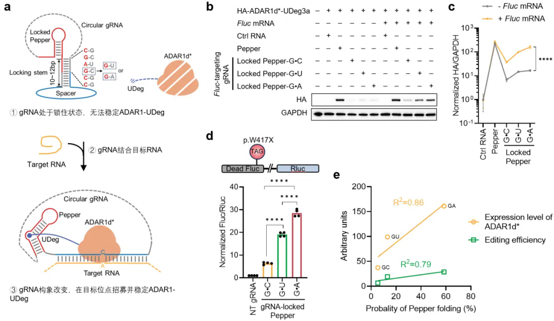 为减少脱靶效应,本研究创造性地应用了“条件性稳定”的设计理念。研究团队对ADAR1脱氨酶结构域(ADAR1d)进行了改造,为其添加了特异性的蛋白降解标签,使其在细胞内处于快速降解的不稳定状态。只有当设计的gRNA与靶标RNA结合时,会诱导gRNA发生构象转换,进而“保护”并稳定与之结合的ADAR1d,使其免于降解并发挥编辑活性。这种“靶标稳定”的机制,确保了脱氨酶的活性被严格限定在目标RNA位置,实现了编辑活性的空间精准控制(图1)。结合对ADAR1d本身进行的结构引导理性工程优化,RECODE系统最终实现了高保真与高效率的统一。