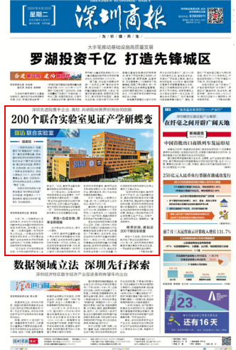 8月23日,《深圳商报》在头版以《200个联合实验室见证产学研蝶变》为题,对我院建立联合实验室这一跨界织网、协同创新的做法进行了重点报道。