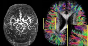 5.0T超高场高分辨成像效果(左:血管成像;右:脑神经纤维束成像)